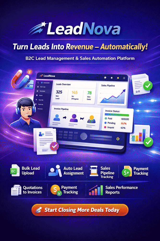 If your business depends on paid advertising and individual lead follow-ups, LeadNova helps you eliminate lead leakage, improve conversion rates, and gain full visibility over your sales pipeline and revenue.